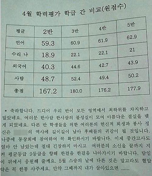 글을 통해 담임선생님은 "축하합니다. 드디어 우리 반이 모든 영역에서 최하위를 차지하고 말았네요. 여러분 한 사람 한 사람의 불성실이 모여 아름다운 결실을 맺게 되었네요"라고 운을 뗐다.