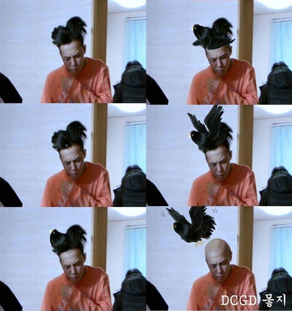 마지막 컷에서 GD의 머리에 있던 까치는 날아가버리고, GD의 머리는 대머리로 변해 더욱 웃음을 자아내고 있다.