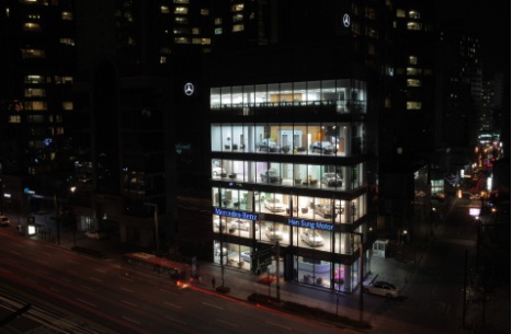 벤츠 코리아 서초 전시장은 지하 2층 지상 6층 등 총 8개 층 2천801m2규모로 1층부터 5층까지 최대 20대의 차량 전시가 가능하다.