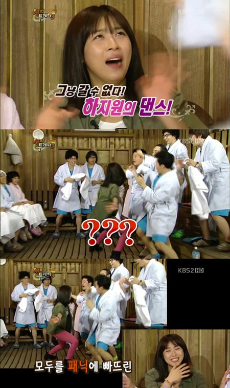 이날 하지원은 G4(김준호, 김원효, 허경환, 정범균, 최효종) 앞에서 '바람 인형 댄스'를 선보였다.