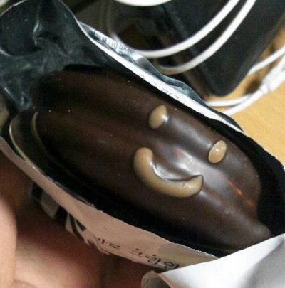 '귀여워서 먹을 수 없어’ 사진을 접한 네티즌들은 "초코파이에 얼굴이~", "정말 귀여워서 먹을 수 없겠네", "얼굴이 귀여워"등의 다양한 반응을 보였다. (사진-온라인 커뮤니티)