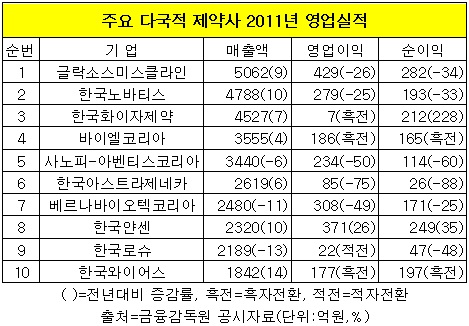 업계 3위 한국화이자제약은 2년 연속 적자경영에서 벗어나 지난해 흑자전환에 성공했다. 이 회사는 지난해 매출액 4천527억원, 영업이익 7억원으로 영업이익률은 0.2%를 기록했다. 이는 2010년 영업이익률 -4.3%에서 4.5%p 높아진 수준이다.