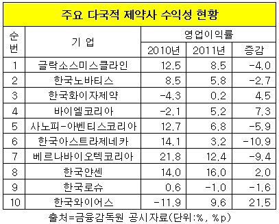 GSK의 영업이익률은 2010년 12.5%에서 지난해 8.5%로 4%p 낮아졌다. 한국노바티스도 2010년 8.5%에서 지난해 5.8%로 2.7%p 떨어졌다.