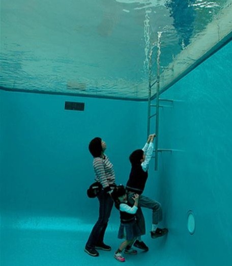 사진을 얼핏 보면 수영장의 물속에 옷 입은 사람들이 있는 것처럼 보이지만 다음 사진을 보면 물이 없는 수영장 수조 안에 사람들이 있는 모습을 볼 수 있다.