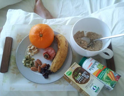 박진영의 건강식단 사진에는 각종 견과류와 오렌지 바나나, 미숫가루와 두유와 야채음료가 차려져 있다.