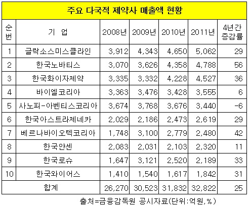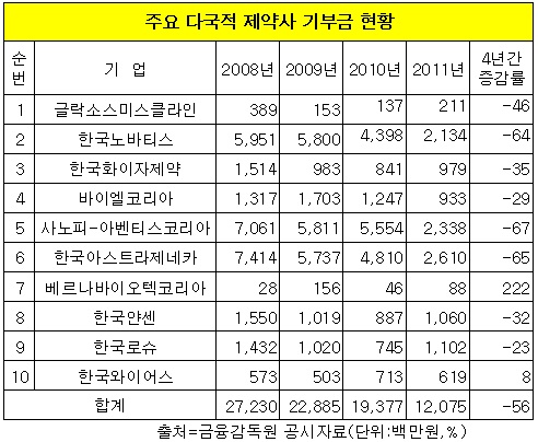 주요 다국적 제약사들이 지난 4년간 매출을 크게 불리면서도 기부금은 절반 이상 줄여 인색함을 드러냈다.