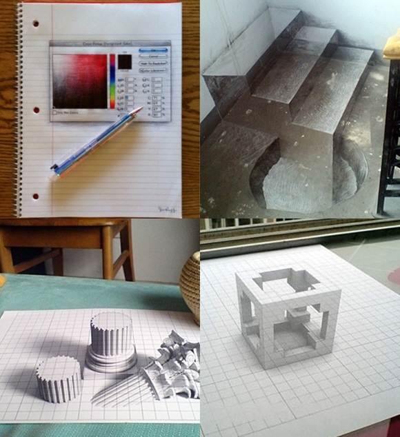 공개된 사진에는 노트에 포토샵 색상 창과, 원기둥, 계단 , 사각형 모형 등을 입체감 있게 그려 실제와 같은 착각을 불러일으킨다.