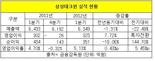 25일 금융감독원의 공시자료에 따르면 삼성테크윈의 1분기 매출액은 6천349억원으로 작년 4분기 대비 22.5%로 하락했지만, 영업이익은 325억원으로 지난 4분기 26억원 적자에서 극적인 흑자전환을 이뤘다.