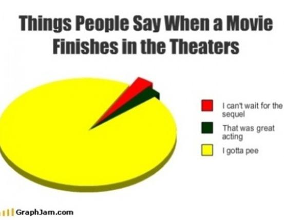 사진의 그래프를 보면 ‘영화 끝나자마자 하는 말’ 1위는 "나 화장실 갈래"였다. 이어 '빨리 다음편 보고싶다', '배우들 연기가 좋았다'는 말을 하지만 1위 '화장실 갈래'는 압도적이었다.