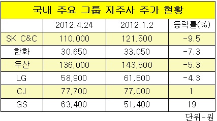 제계 관계자는 "지주사들은 올해 대선을 앞두고 대기업 지배구조 이슈에 따른 리스크가 상대적으로 적다는 점이 긍정적 요인"이라며 "특별한 오너 문제만 없다면 계열사들의 실적 부진이 현재 지주사 주가 하락을 이끄는 것으로 볼 수 있다"고 말했다.