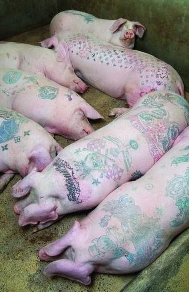 사진에는 돼지들이 누워있는 모습이다. 이 돼지들의 등에는 문신처럼 그림이 찍혀있다.