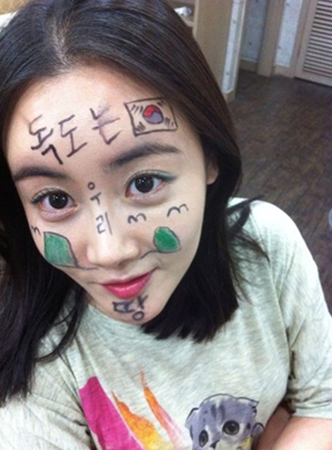 게재된 사진에서 황우슬혜는 얼굴에 독도는 우리땅이라는 낙서를 하고 태극기와 독도를 그려 넣었다.