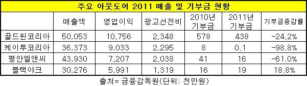 아웃도어 업체들이 실적 잔치를 벌이면서도 기부에는 크게 인색한 것으로 조사됐다.