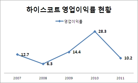 반면 영업이익은 롤러코스터를 타고 있다. 2010년 전년대비 117% 급증한 102억원을 기록했지만 지난해는 다시 62.7 급감한 38억원으로 집계됐다.