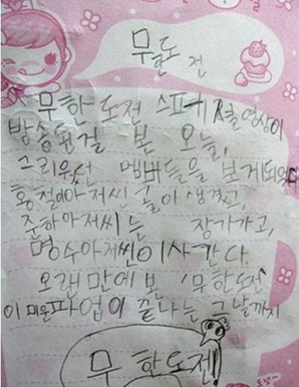 이 초등생 팬은“‘무한도전’스페셜 영상이 방송된 걸 본 오늘. 그리웠던 멤버들을 보게 되었다. 홍철 아저씬 (가슴)골이 생겼고, 준하 아저씨는 장가가고, 명수 아저씨는 이사간다. 오랜만에 본 ‘무한도전’, 이 미운 파업이 끝나는 그날까지 무한도전”이라고 적혀있다.