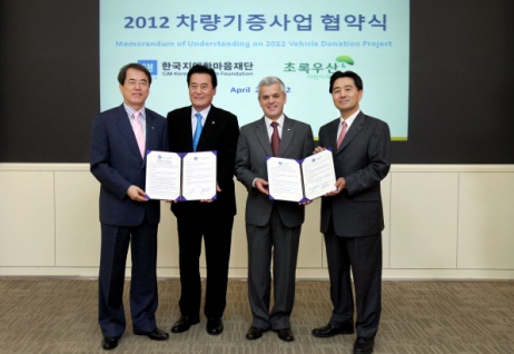 한마음재단은 25일 한국지엠 부평본사 홍보관에서 세르지오 호샤 사장을 비롯해 이제훈 초록우산 어린이재단 회장, 탤런트 김성환, 행복메신저 등 관계자 10여 명이 참석한 가운데 2012년 차량기증사업에 대한 협약을 맺었다.