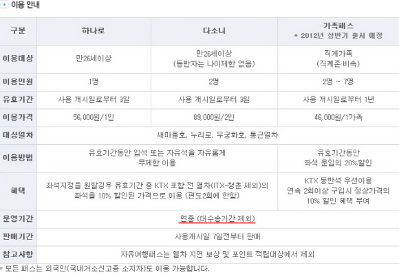 ‘다소니 패스’는 2인에 8만 9천원이며 사용 개시일로부터 3일간 새마을호, 누리로, 무궁화호, 통근열차를 입석 또는 자유석으로 무제한 이용가능하도록 만든 상품.