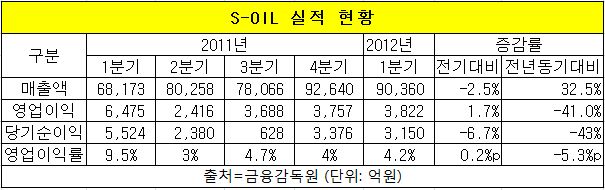 27일 금융감독원의 공시자료에 따르면 S-Oil의 1분기 영업이익은 3천822억원으로 전기 대비로는 1.7% 증가했으나 전년 같은 기간 대비로는 무려 41%가 줄었다.영업이익률도 4.2%로 전기대비 0.2%p가 증가했으나 전년 동기 대비로는 5.3%p가 떨어졌다. 반대로 매출액은 9조360억원으로 전기대비 2.5%가 감소했으며 전년 동기 대비 32.5% 상승했다.