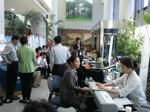정부광주합동청사(소장 이기흥)는 한국건강관리협회 광주전남지부(본부장 이균익)와 26일 정부광주합동청사 로비에서 금연상담, 혈관나이측정, 당뇨·콜레스테롤·체성분·스트레스·조갑주름모세혈관 검사와 5대암 배너, 금연관련 판넬 등을 전시한 건강캠페인을 가졌다.