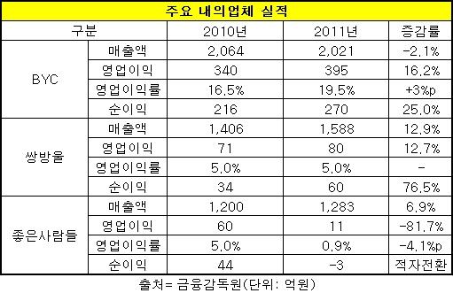 30일 금융감독원 공시 자료에 따르면 BYC는 지난해 영업이익과 순이익이 각각 395억원, 270억원으로 전년대비 16.2%, 25% 증가하며 야무진 실적을 챙겼다.