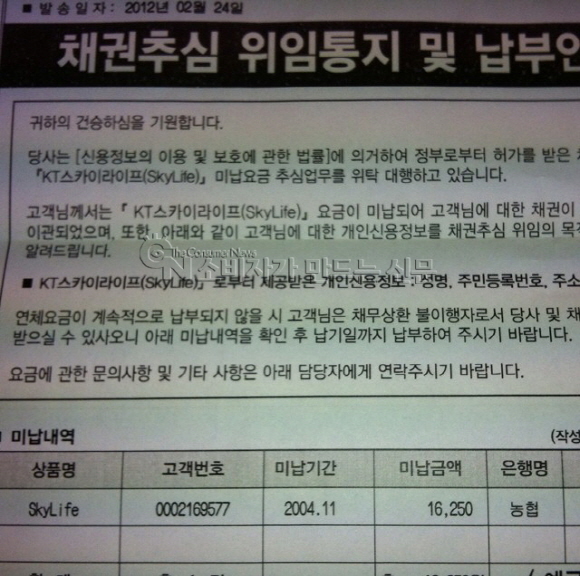 통지서 내용에는 이 씨의 여자친구가 2004년 11월 KT스카이라이프의 요금 1만 6천여원을 미납하여 채권추심이 이뤄진다는 것.