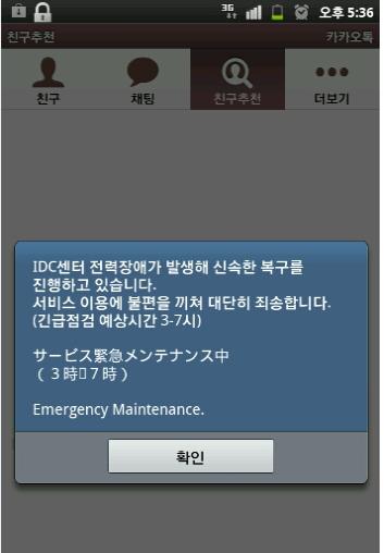 카카오톡은 28일 일부 서버의 전력 문제로 2시 50분 경부터 긴급 점검에 들어갔다.