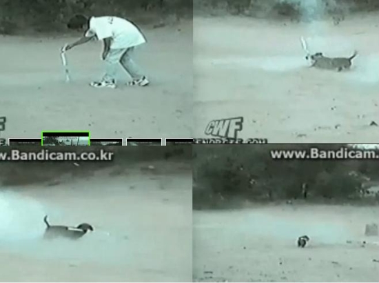 개가 달려오자 주변에 있던 다른 강아지와 사람들은 폭죽을 물고있는 강아지를 피해 달아난다.