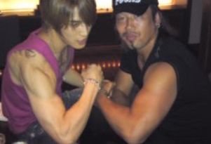 사진 속 김재중은 보라색 민소매 티셔츠를 입고 지인과 팔 씨름 자세로 근육을 자랑하고 있다.