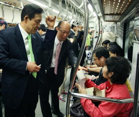 김정태 회장은 그 일환으로 30일 지하철을 타고 출근, 지하철 안에서 만난 고객들에게 머그컵을 나눠주면서 고유가에 대응하는 차량 5부제 실시와 1회용품 사용 자제를 적극 홍보했다.