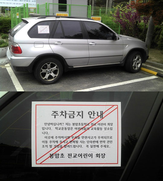 어린이 회장의 패기가 느껴지는 공고문에는 "안녕하십니까? 저는 봉암 초등학교 어린이 회장입니다. 이곳에 주차하시면 우리들 안전사고가 우려되므로 이동 주차해 주시고 반복될 시는 단속반에 연락 견인 조치 할 것임을 알려 드립니다"라고 당당함이 느껴지는 문구를 적어 감탄을 자아내고 있다.