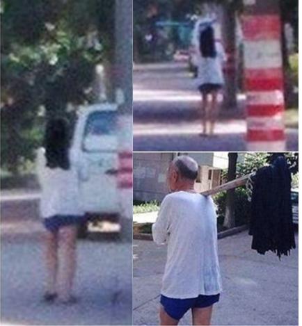 사진을 살펴보면 한 여성이 짧은 바지를 입고 다리를 드러내며 걸어가고 있다. 그러나 다음 사진을 보면 이 검은 머리의 여신은 다름아닌 대걸레를 지고 가는 할아버지였던 것.