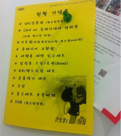 공개된 사진에는 헌혈을 하면 받을 수 있는 것들의 목록을 적어놓은 종이가 담겨있다.