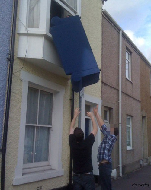 이들은 2층 창밖으로 내려보내는 소파를 받으려고 액션을 취하고 있다.
