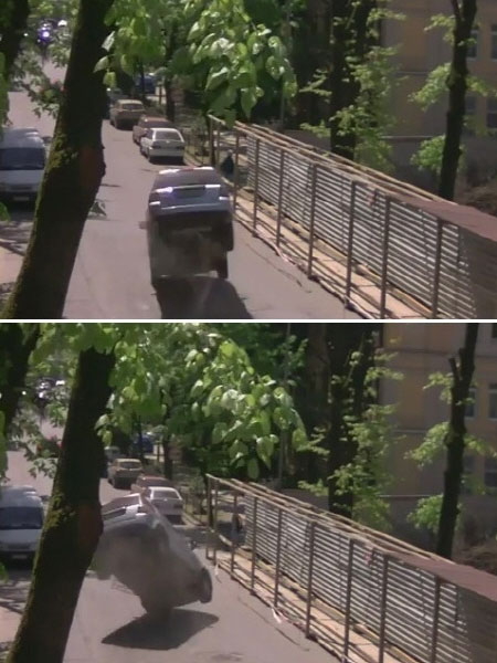 도로의 맨홀 위를 지나는 순간, 갑자기 자동차가 공중제비를 돌며 공중으로 날아가고 몇 바퀴를 구른 후에야 멈췄다. 맨홀이 펑 터지면서 폭발했고, 그 위력으로 자동차가 뒤집힌 것이다. 사고 이후 놀란 사람들이 몰려들고 운전자의 상태를 살폈다.