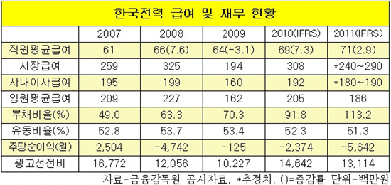 한전은 지난 2007년 1조5천568억원의 당기순이익을 기록했으나 2008년에는 2조9천524억원의 순손실을 기록했다. 2009년 777억원으로 손실 폭을 줄였으나 2010년 1조4천782억원, 작년에는 3조5천141억원으로 적자 규모가 더욱 커지고 있다.