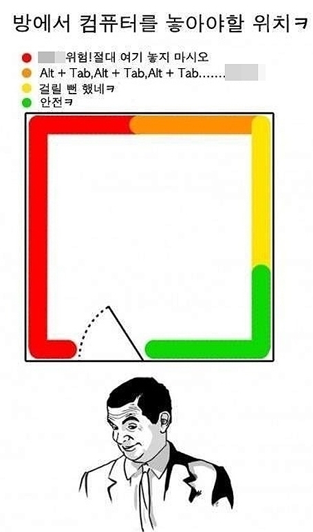 붉은 색으로 표시된 장소는 주로 부모님이 문을 예고 없이 열었을 때 게임이나 부적절한 콘텐츠를 바로 감추기 힘든 곳으로, 게시자는 문을 열었을 때 나타나는 사각지대를 컴퓨터를 놓는 가장 안전한 장소로 추천하고 있다.