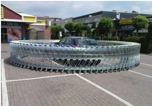 사진 속에는 한 자동차가 빽빽하게 이어져 있는 마트 카트 속에 주차 되어있다.