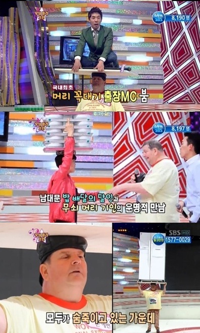 5일 방송된 SBS ‘놀라운대회 스타킹’에는 무쇠 머리 기인 영국인 존에반스(65) 씨가 출연했다. MC 붐을 머리 위로 올리고 등장한 기인의 표정은 평온해보였다. 그는 “18살때 생계 때문에 공사장에서 벽돌을 올려봤다. 그때 18개까지 올렸는데 기네스 세계 기록으로 41개까지 올려봤다”고 고백했다.