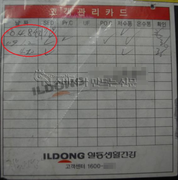분기별로 필터 교체를 해준다는 조건과 제조사가 일동제약의 계열사라는 점이 믿음이 갔다고. 하지만 2009년 4월을 마지막으로 3년간 필터교체가 이뤄지지 않았고, 고객관리카드에 적힌 일동생활건강 고객센터번호로 수차례 전화해 교체를 요청했지만 방문은 커녕 연락조차 없었다고.