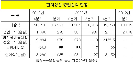 현대상선은 2010년 4분기 영업이익이 1천700억원에 육박했지만, 지난해 1분기 275억원의 영업손실을 기록하며 적자전환 됐다.