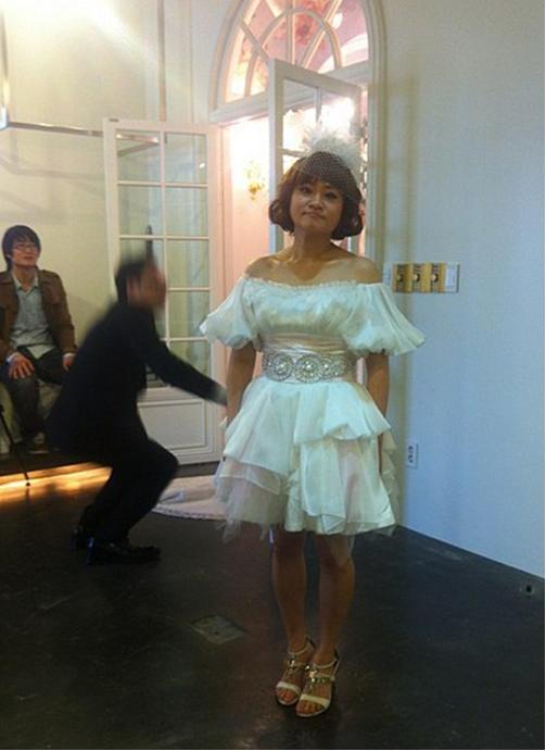 공개된 사진에는 김신영이 짧은 미니 웨딩드레스를 입고 포즈를 취하고 있다.