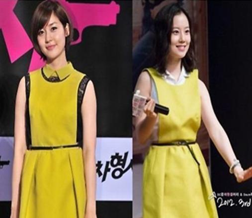 사진에서 성유리와 문채원은 같은 옷을 입고 있다. 두 사람은 똑같이 노란색 원피스를 입고 있다.