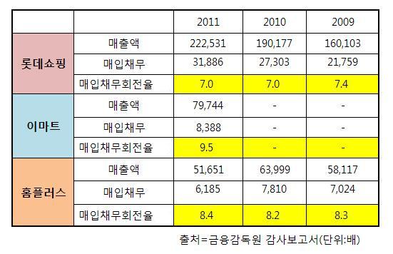 9일 마이경제 뉴스가 10일 동반성장위원회의 대기업 동반성장 결과 발표에 앞서 유통부문에 속한 롯데쇼핑(대표 신헌), 이마트(대표 정용진), 홈플러스 (대표 이승한)의 최근 3년간 매입채무회전율(연결기준)을 조사한 결과 롯데쇼핑이 가장 낮은 수치를 나타냈다.