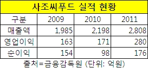 사조씨푸드는 매출 등 실적이 꾸준한 성장세를 나타내고 있다. 9일 금융감독원 공시자료에 따르면 사조씨푸드의 2010년 매출액은 전년대비 10% 증가했고 작년에는 27.8% 증가하는 등 성장폭이 커졌다. 작년 매출액은 2천808억원이었다.