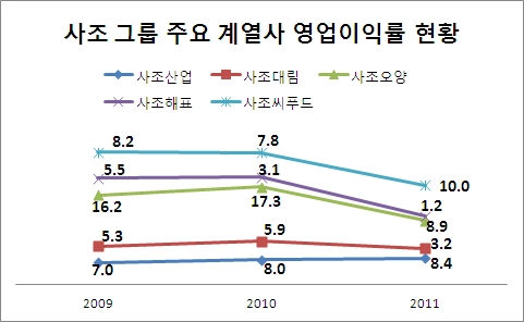 이로써 실질적 수익성을 반영하는 영업이익률도 명암이 엇갈렸다. 사조씨푸드 영업이익률이 10%로 가장 높았고 사조오양 8.9%, 사조산업 8.4%, 사조대림 3.2%, 사조해표 1.2% 가 뒤를 이었다.