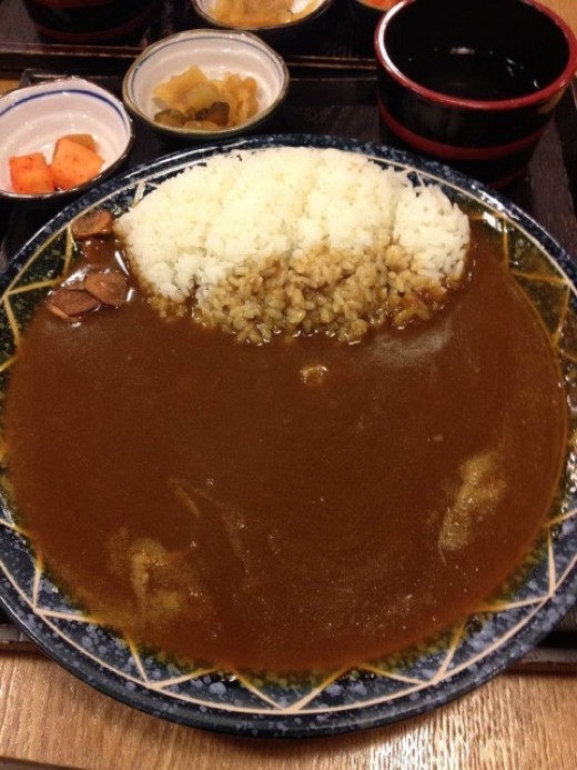 이 카레는 큰 접시 한 가득 카레가 담겨져 있고 접시 한 귀퉁이에 밥이 담겨 있어 황당함을 전하고 있다.