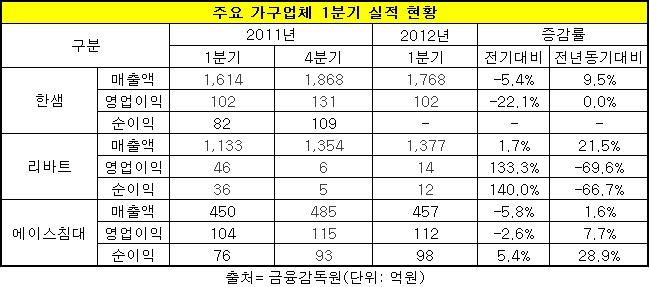 잘나가던 한샘과 에이스침대는 급제동이 걸린 반면 적자전환하며 고전하던 리바트는 상승세를 탔다.