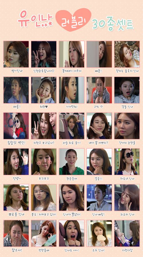 사진에서 유인나는 메롱, 기가막혀, 고민중, 깜놀, 부끄부끄 등 여러가지 귀여운 애교 표정을 짓고 있다.