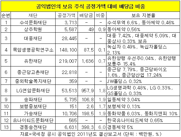 또 재벌기업인 LG그룹의 LG연암문화재단의 경우 공정가액이 무려 535억원이 넘는 지분(LG생명과학 0.48%, LG 0.33%, GS홀딩스 0.33%)을 보유하고 있으나 배당금이 10억원도 안 돼 시장금리보다 낮은 1.8%를 기록했다.