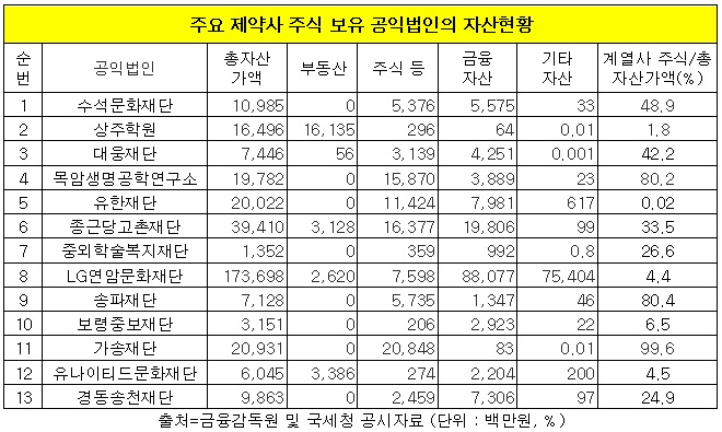 한 재계 관계자는 "회사 주식을 전체 자산의 40~50% 이상 보유하고 있음에도 배당이 없다는 것은 해당 주식으로 얻을 수 있는 수익이 '0'라는 의미"라며 "공익법인들이 보유하고 있는 계열사 지분으로 공익사업 수행을 위한 재원 마련에 별반 기여하지 않고 있다"고 꼬집었다.
